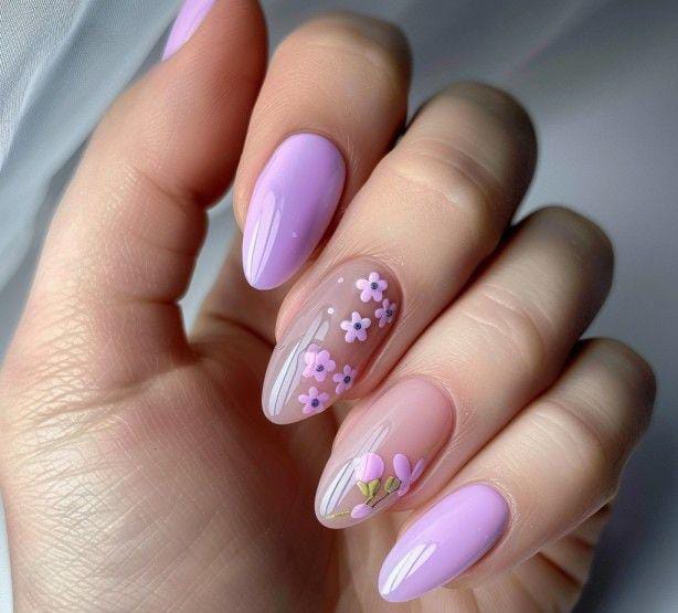 Soft lavender nails are paired with sheer nude accents decorated with tiny purple flowers and a small tulip design. The look feels delicate, feminine, and perfect for a soft April spring aesthetic.