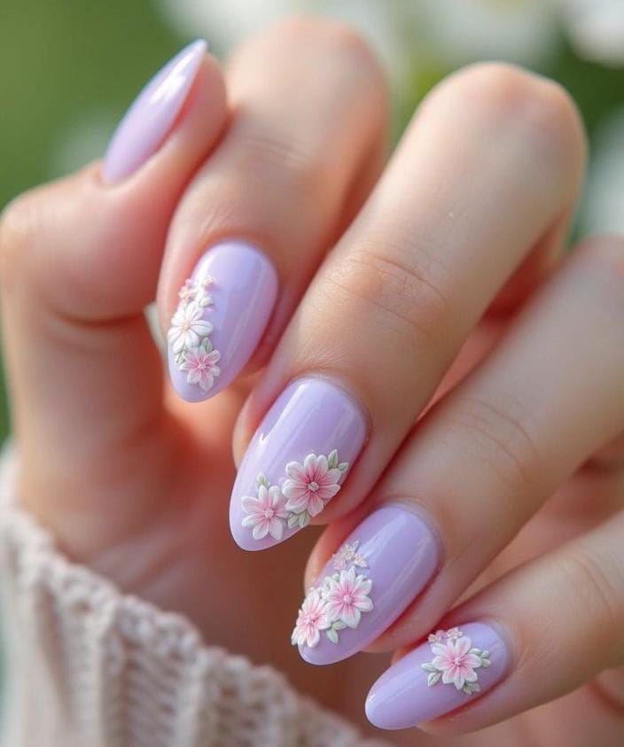 Glossy lilac April nails are enhanced with raised pink floral details that create a gentle 3D effect. The design feels elegant, romantic, and beautifully inspired by blooming spring flowers.