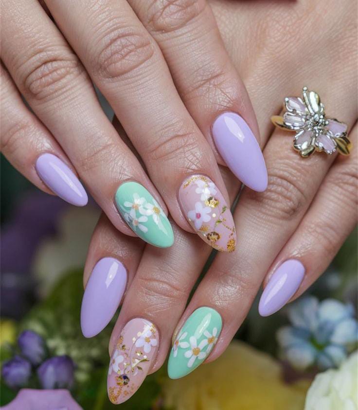 A mix of pastel lavender, mint green, and soft pink nails is decorated with delicate daisy flowers and tiny gold flakes accents. The overall look is bright, playful, and full of cheerful spring vibes and perfect for April.