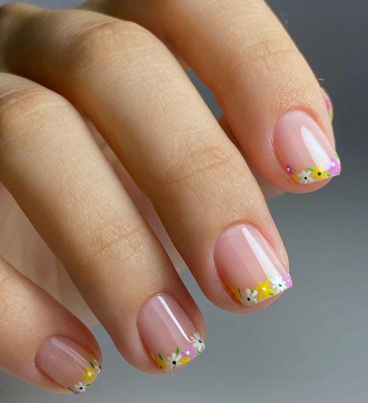 A soft nude base with tiny colorful daisy flowers placed along the nail tips creates a fresh and delicate spring look. The design feels light, minimal, and cheerful with pastel colors that give a cute April garden-inspired vibe.