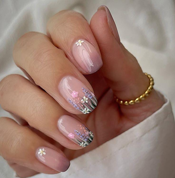 A sheer pink ombre base is decorated with small pastel flowers and thin green stems that look like a tiny spring garden. The design feels soft, elegant, and slightly playful with a calm april aesthetic.