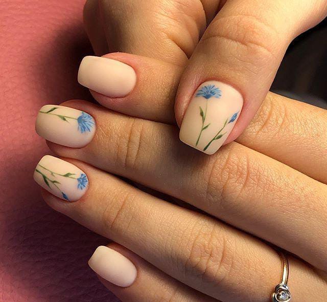 A matte nude base is paired with delicate blue wildflowers and thin green stems for a calm spring-inspired look. The design feels simple, fresh, and slightly April botanical with a soft natural vibe.