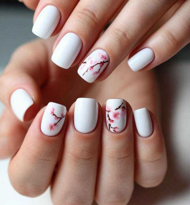 A clean white base is decorated with delicate pink cherry blossom branches that give the nails an elegant spring feel. The design looks soft, minimal, and feminine with a gentle floral April vibe.