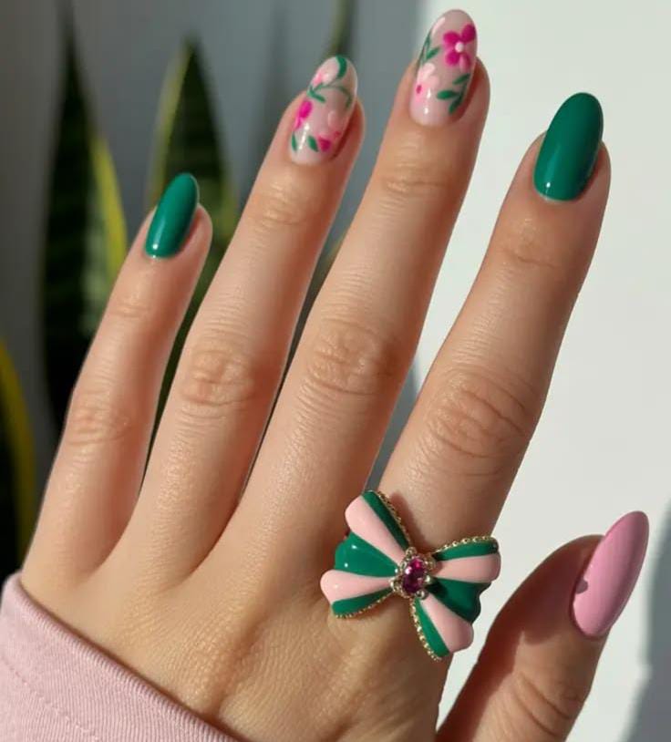 Deep green April nails are paired with soft nude and pink accents featuring simple floral patterns. The design feels vibrant, stylish, and inspired by blooming spring gardens.