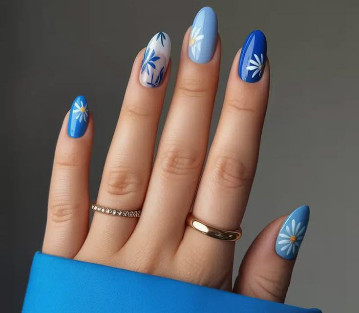 Different shades of blue paired with simple white daisy accents give this manicure a calm yet vibrant spring feel. The glossy finish and floral touches create a clean, fresh look inspired by clear April skies.