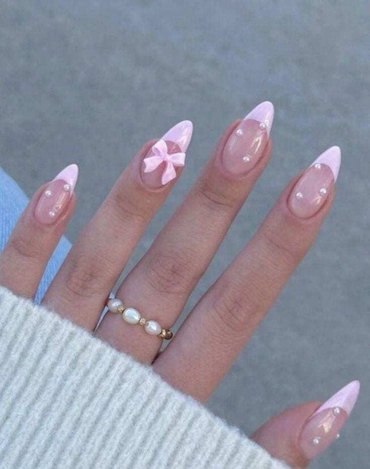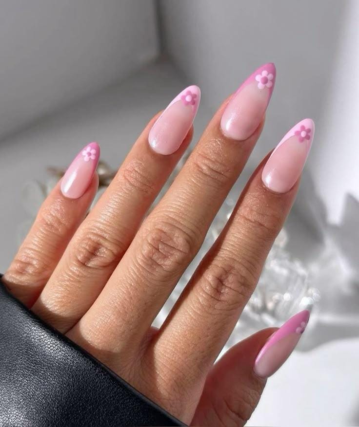 These nails combine a milky pink base with classic pink French tips and subtle flower details. The look is sweet, feminine, and effortlessly spring-ready.