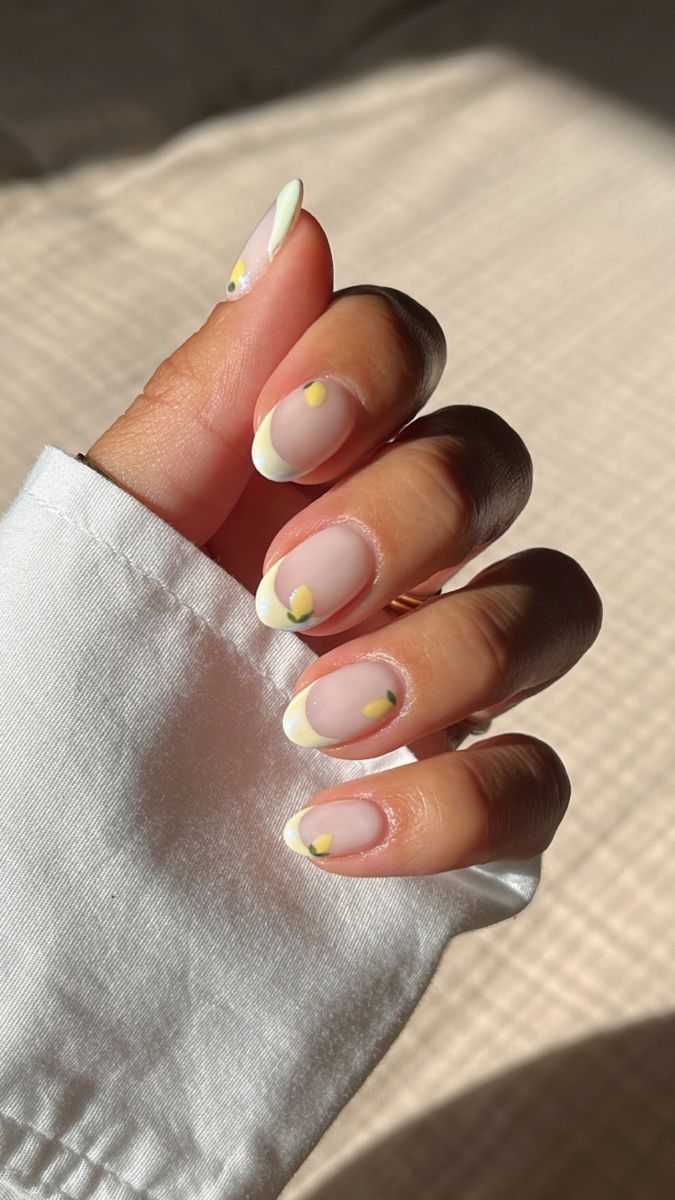 Soft almond nails feature a sheer nude base with pale yellow French tips and tiny lemon accents. The look feels fresh, light, and perfect for early spring.