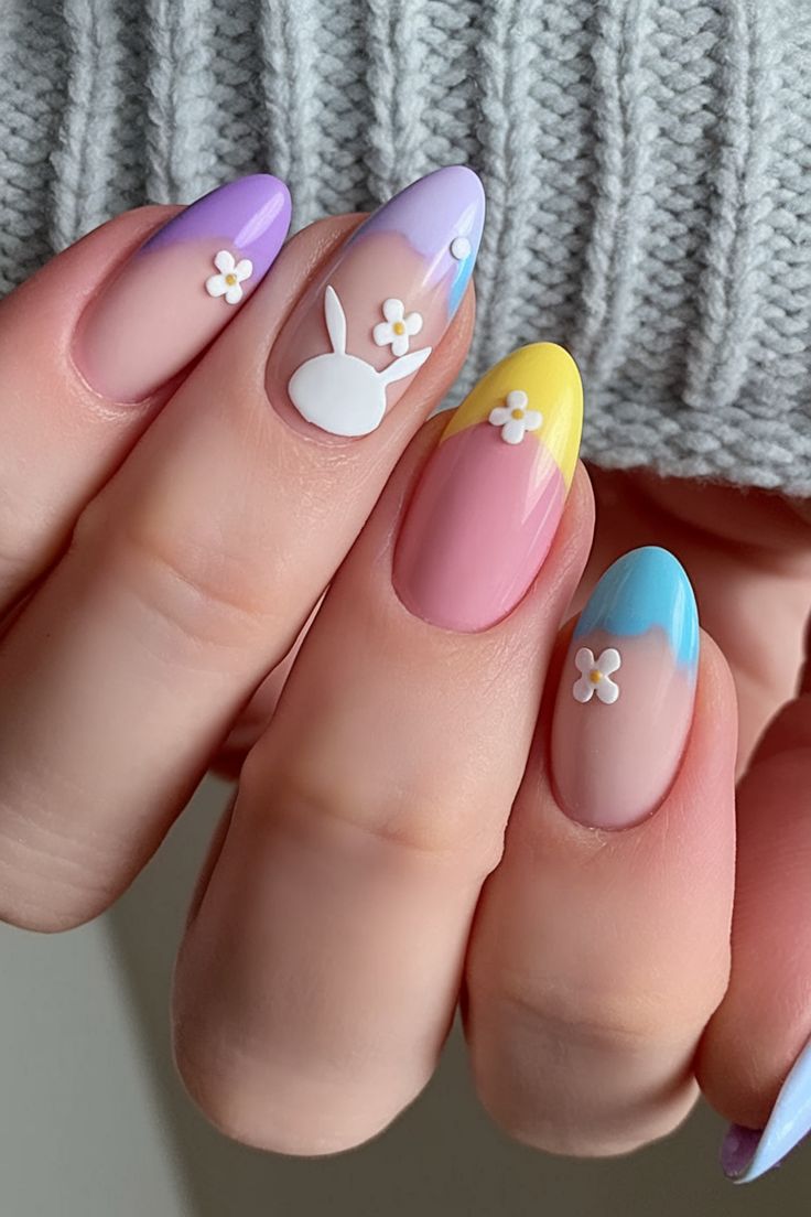 Muted pastel French tips mix lilac, yellow, blue, and pink with small floral details and a rabbit face on one nail . The overall vibe is sweet, soft, and cheerful like a spring bouquet.