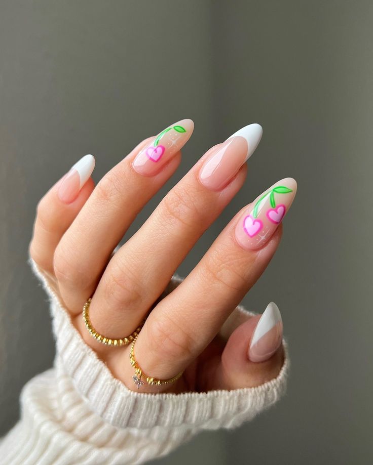 Milky nude nails are paired with crisp white French tips and delicate cherry art. This design feels feminine, playful, and subtly romantic for spring.