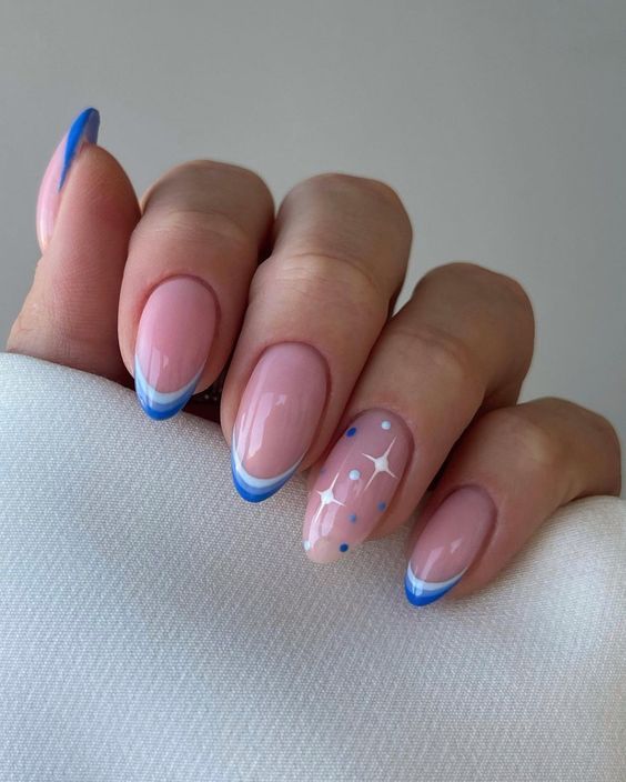 Classic nude almond nails are paired with crisp blue French tips for a clean, airy look. Subtle dots and star details give it a light, modern spring touch.