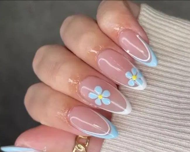 Soft nude nails are finished with pale blue French tips and delicate daisy designs. The overall look is sweet, fresh, and perfect for springtime.