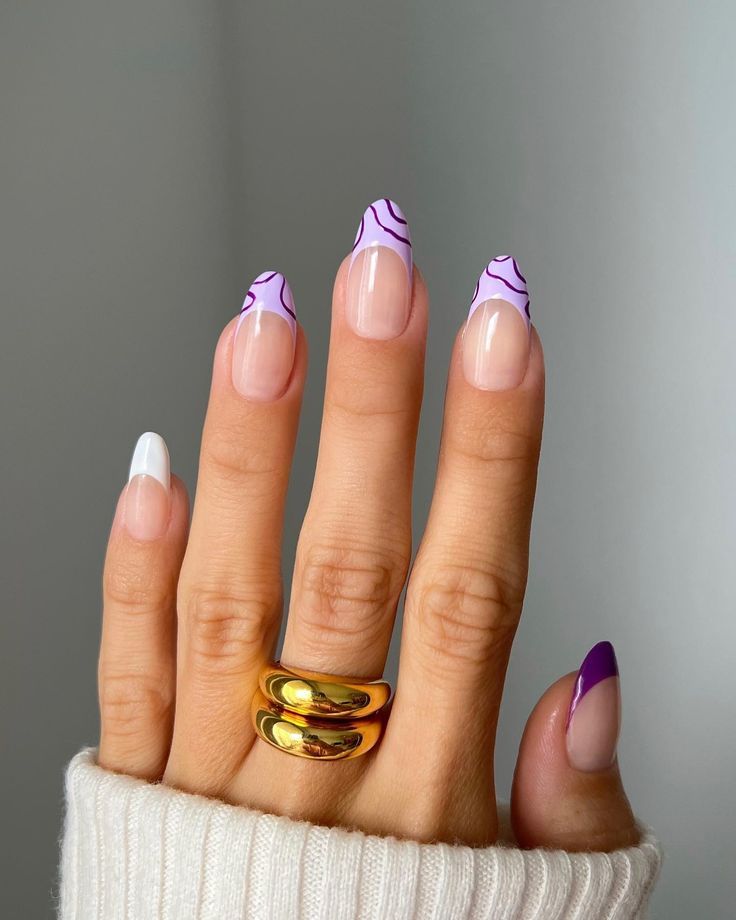 A clean nude base is paired with pastel lavender French tips accented by flowing swirl lines. The look feels modern, fresh, and playful while staying minimal.