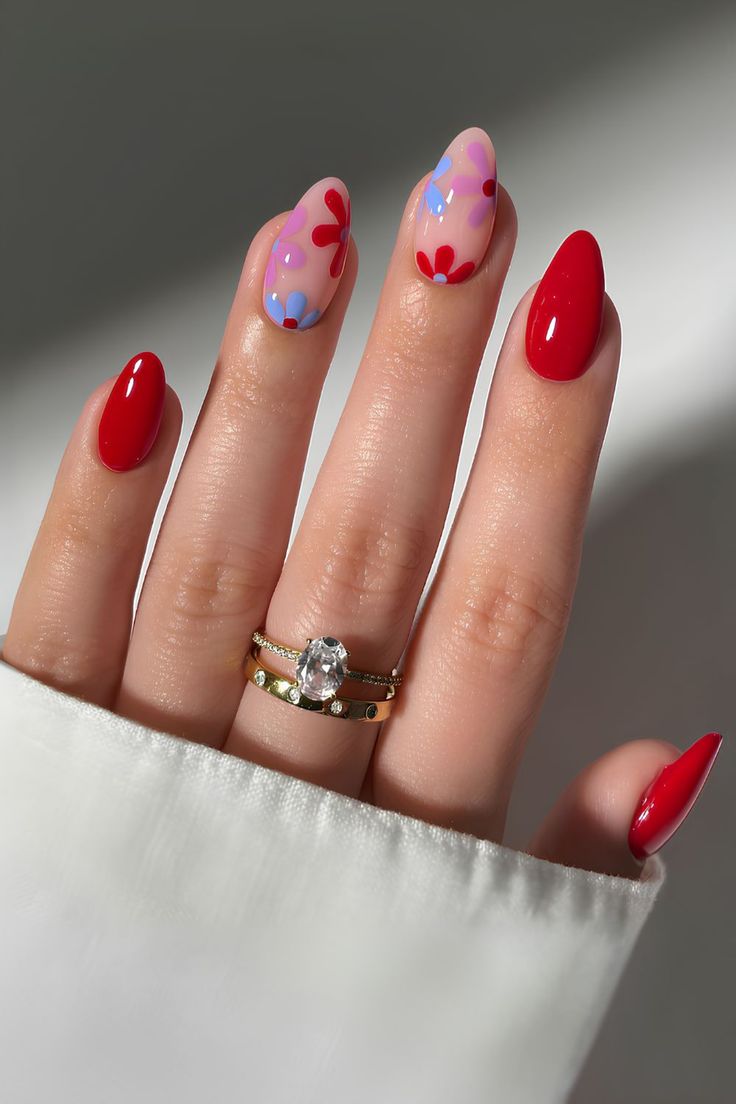 Soft nude bases are paired with bold red French tips and playful pastel flower accents. The vibe is fun, artistic, and slightly retro with a fresh spring feel.
