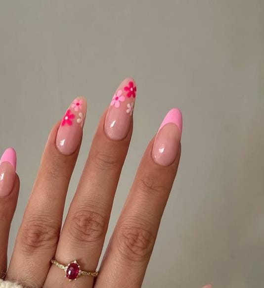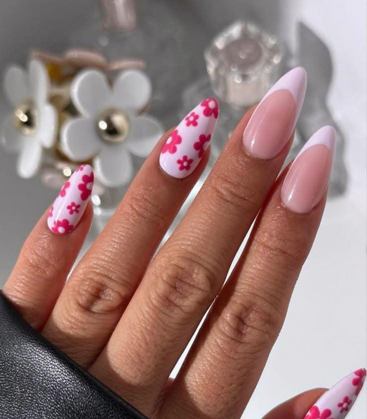 This design features soft pink almond nails with classic white French tips, accented by playful pink floral patterns on accent nails. The overall vibe is sweet, fresh, and perfect for springtime.