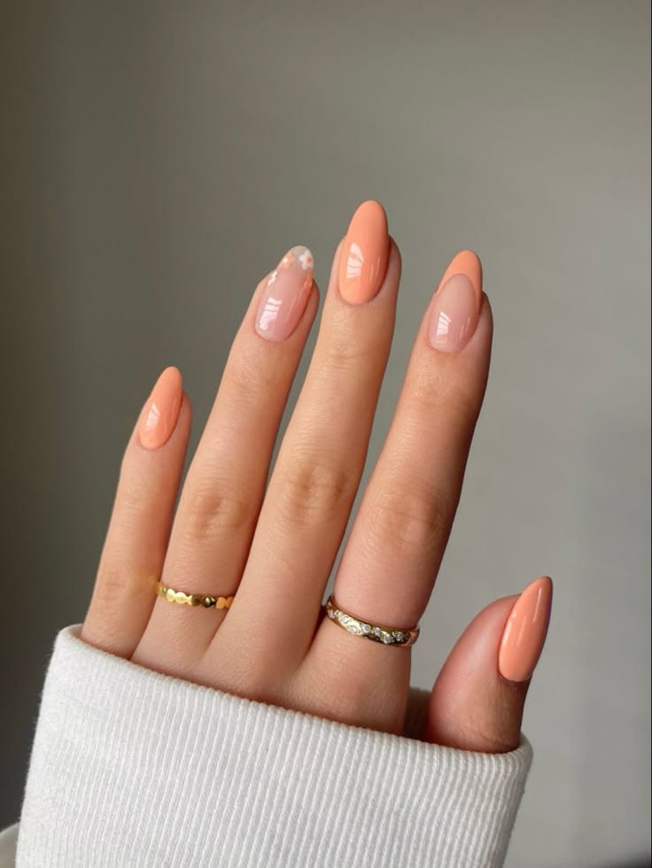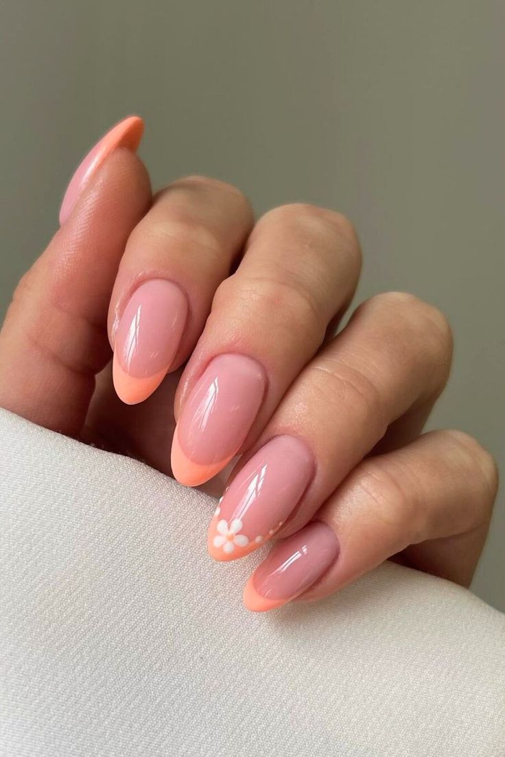 Warm peach French tips fade softly over a natural pink base, with a subtle floral accent nail. The design feels minimal, fresh, and softly elegant.
