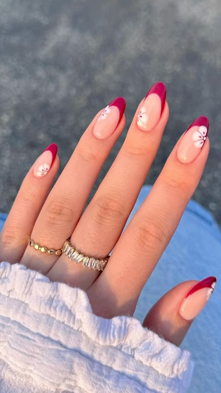 A nude base fades into bold berry-toned French tips with minimal white floral accents. The look is modern and elegant with a slightly dramatic spring twist.