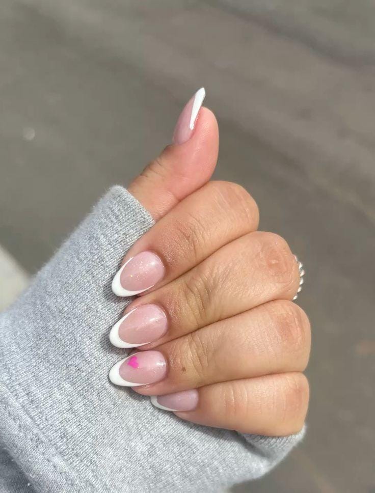 Soft blush pink almond nails feature crisp white French tips, with a tiny pink heart accent adding a sweet, minimal touch. The overall vibe is clean, romantic, and effortlessly spring-ready.