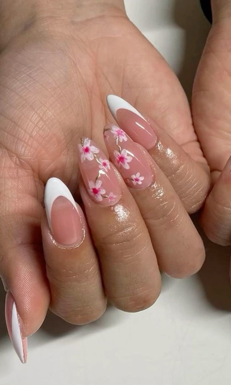 A sheer nude base is paired with white French tips and delicate pink floral details. The design feels fresh and elegant, inspired by spring blossoms and soft femininity.