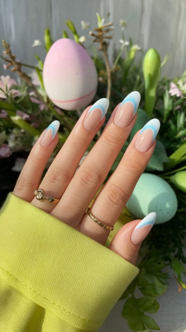 Almond nails feature smooth nude bases with gradient-style blue and white French tips. The design feels clean, glossy, and effortlessly spring-ready.