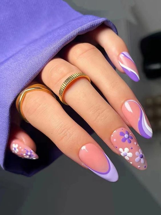 This design combines a soft pink base with lilac French tips and playful floral accents. The vibe is fun yet polished, blending pastel tones with a floral spring mood.