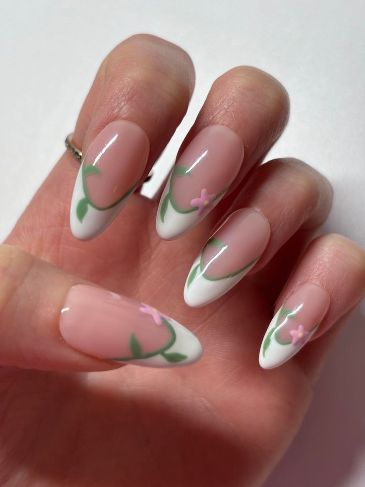 Muted pink nails are finished with white French tips and subtle green vine details with tiny flowers. The style feels natural and botanical, giving a gentle, garden-inspired spring look.
