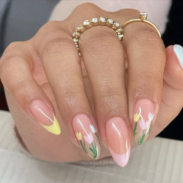 This design features sheer pink almond nails with pastel yellow and white floral accents, paired with a subtle spring-inspired French tip. The overall vibe is fresh, delicate, and perfect for a soft, romantic spring look.