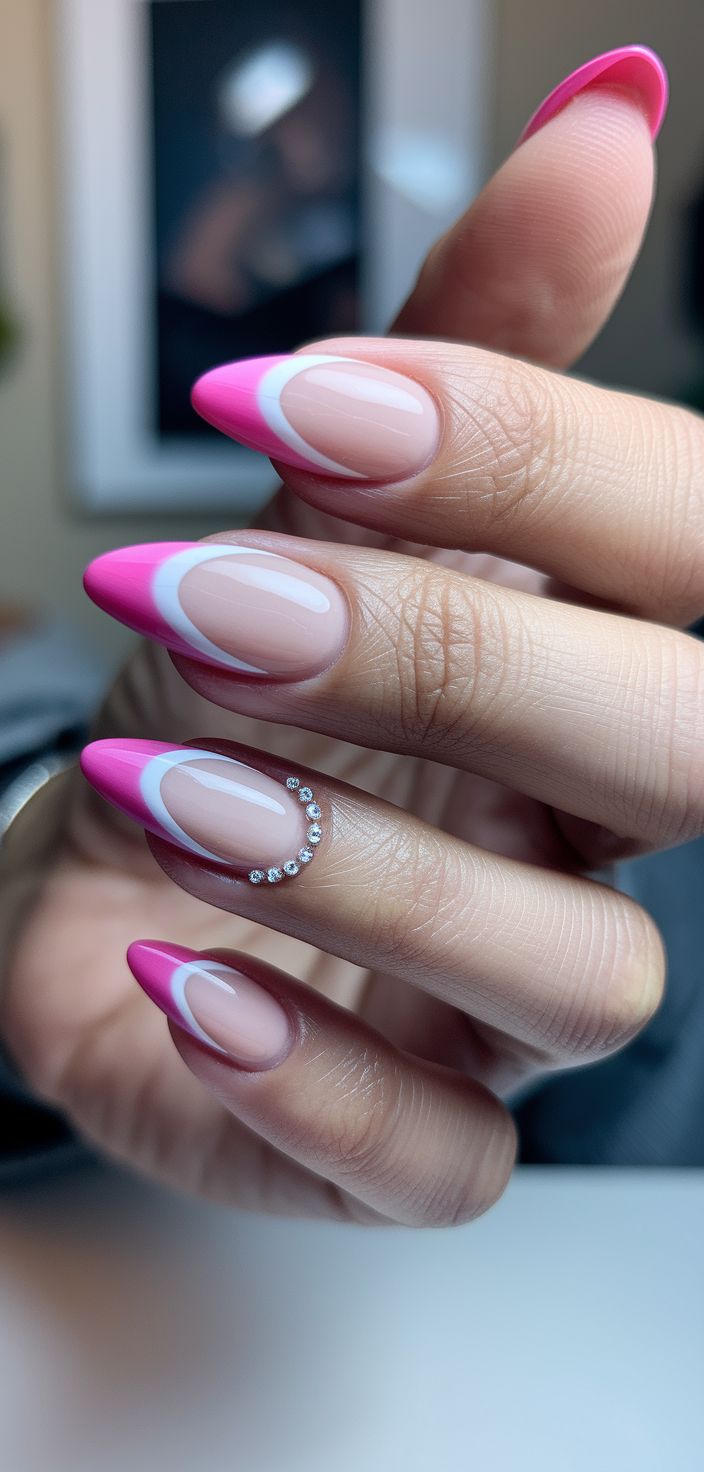 Bright pink French tips are layered with a soft white curved line over a nude base, creating a modern and playful contrast. The design feels bold yet clean, giving a chic and energetic spring vibe.