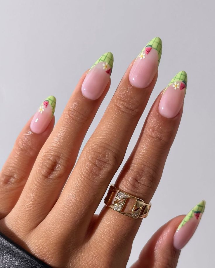This design combines a sheer pink base with green checkered French tips decorated with tiny melon and floral details. It has a cheerful, whimsical vibe that feels fun and spring-ready.