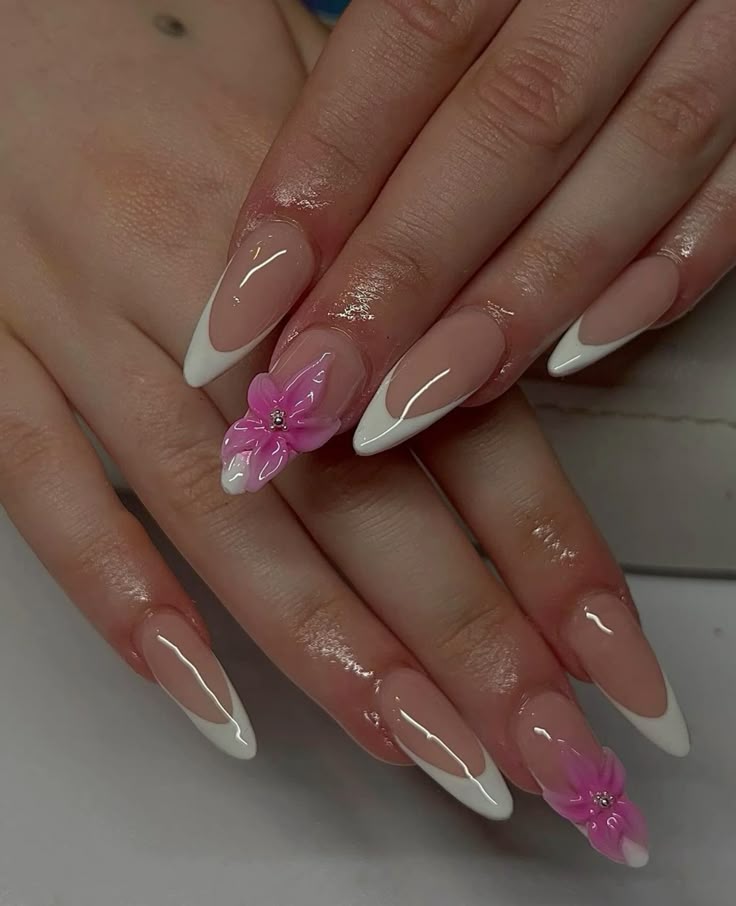This design combines nude almond nails with crisp white French tips and 3D pink floral accents. The vibe is elegant and slightly glam, perfect for spring events or statement nails.