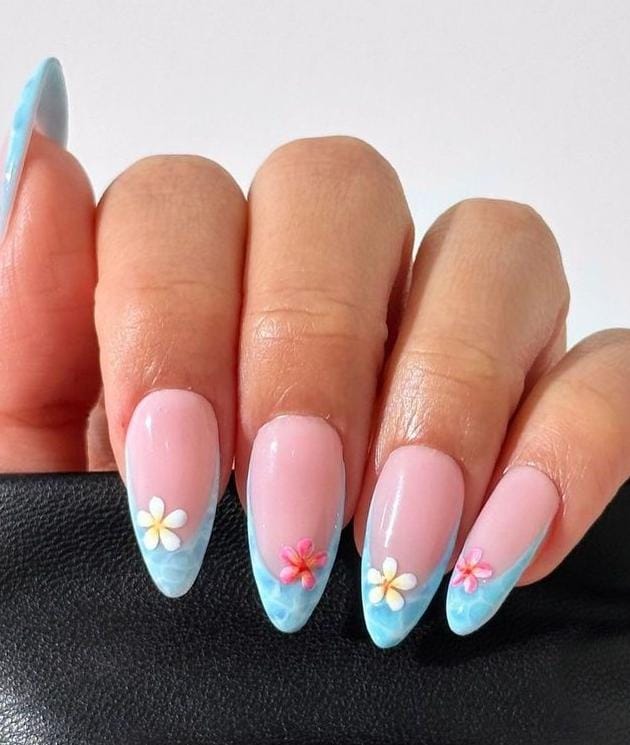 This design features soft pink almond nails with sheer sky-blue French tips and tiny floral accents. The overall vibe is fresh, delicate, and perfect for a light spring look.