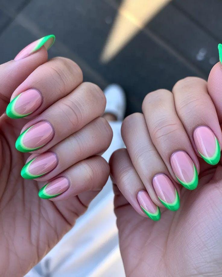A modern take on French tips with a glossy nude base and crisp neon green outlines. The style feels bold, clean, and playful while still staying minimal.