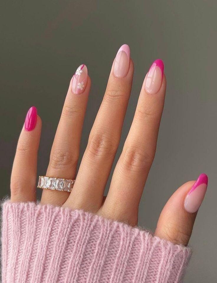 This design blends soft pink bases with bright pink French tips, accented by small white flowers. It has a cheerful, flirty vibe with a fresh seasonal twist.