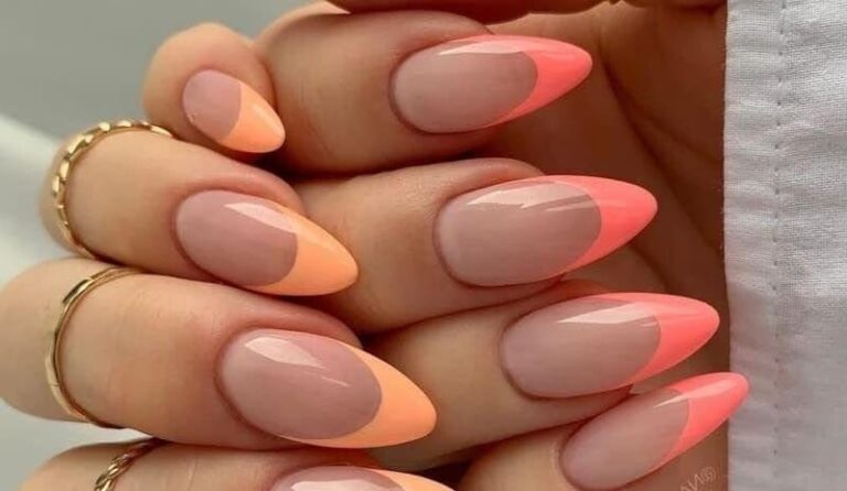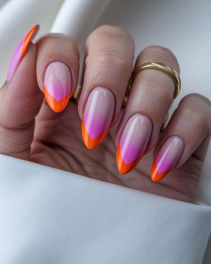 A nude base is paired with layered pink and vibrant orange French tips in a wave-like pattern. The overall style feels warm, energetic, and perfect for spring transitioning into summer.