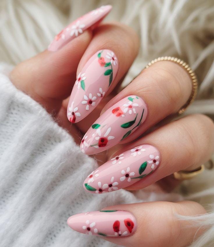 Soft blush pink almond nails are decorated with delicate white and red floral accents for a romantic spring feel. The overall look is feminine, fresh, and hand-painted in style.