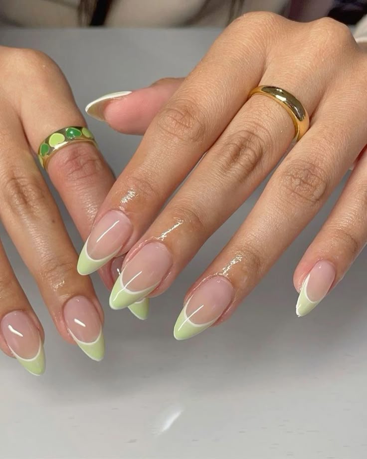 A sheer nude base is paired with pastel green French tips for a clean, modern spring look. The design feels minimal, glossy, and effortlessly chic.