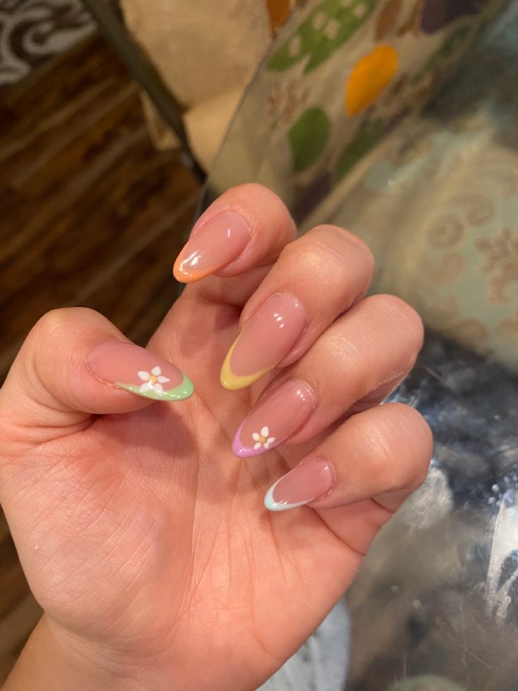 This design features almond nails with soft nude bases and pastel French tips in pink, yellow, green, and orange. Tiny floral accents add a playful, fresh spring feel.