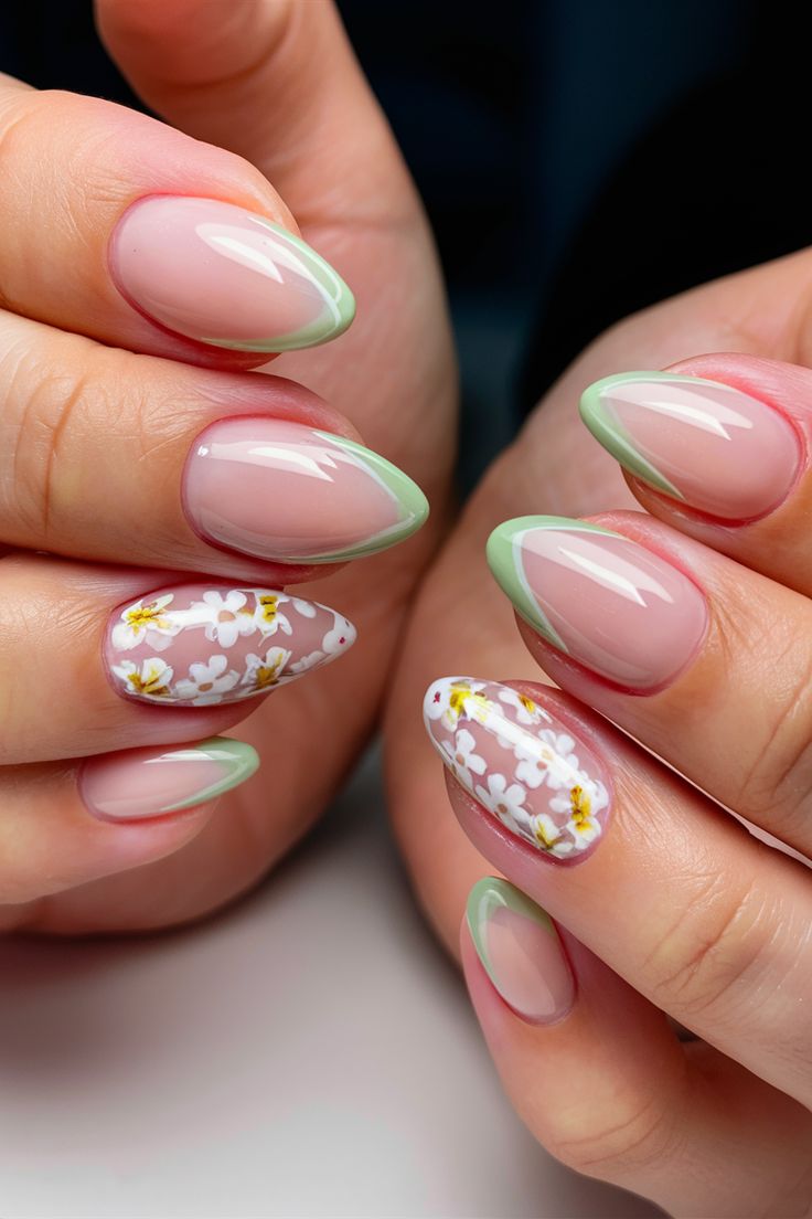 Translucent pink nails are finished with soft green French tips and subtle white daisy details. The design feels airy, elegant, and inspired by blooming gardens.