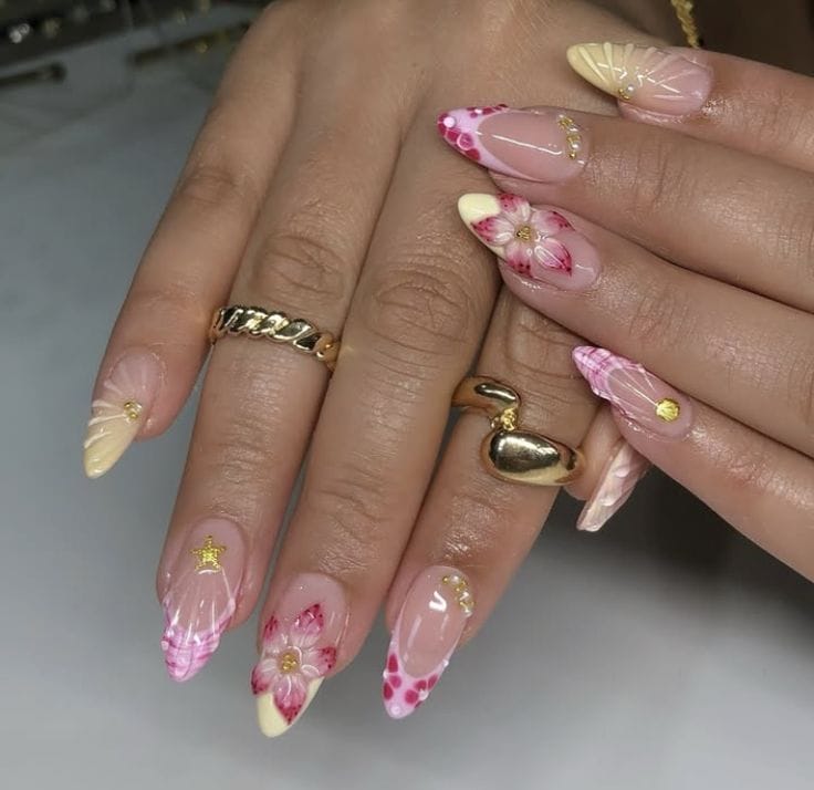 A mix of nude pink bases and pastel French tips is elevated with delicate floral art and subtle gold accents. The style feels romantic, polished, and softly feminine.