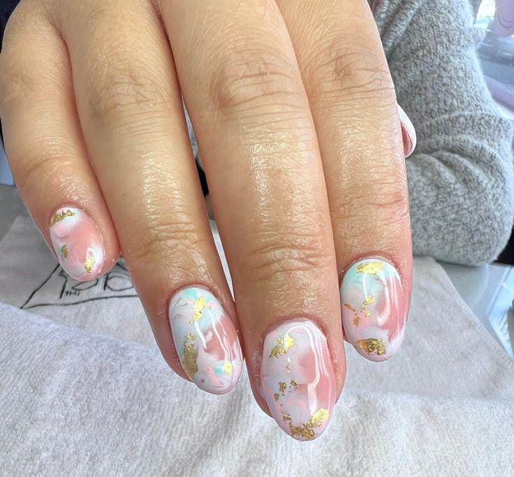 Soft nude bases are blended with pastel pinks, blues, greens, and hints of yellow in a fluid marble style. Gold foil accents add a light, artistic spring glow.