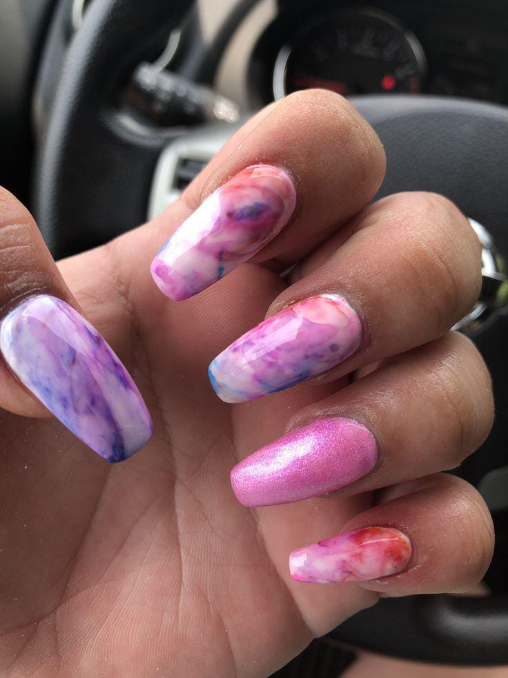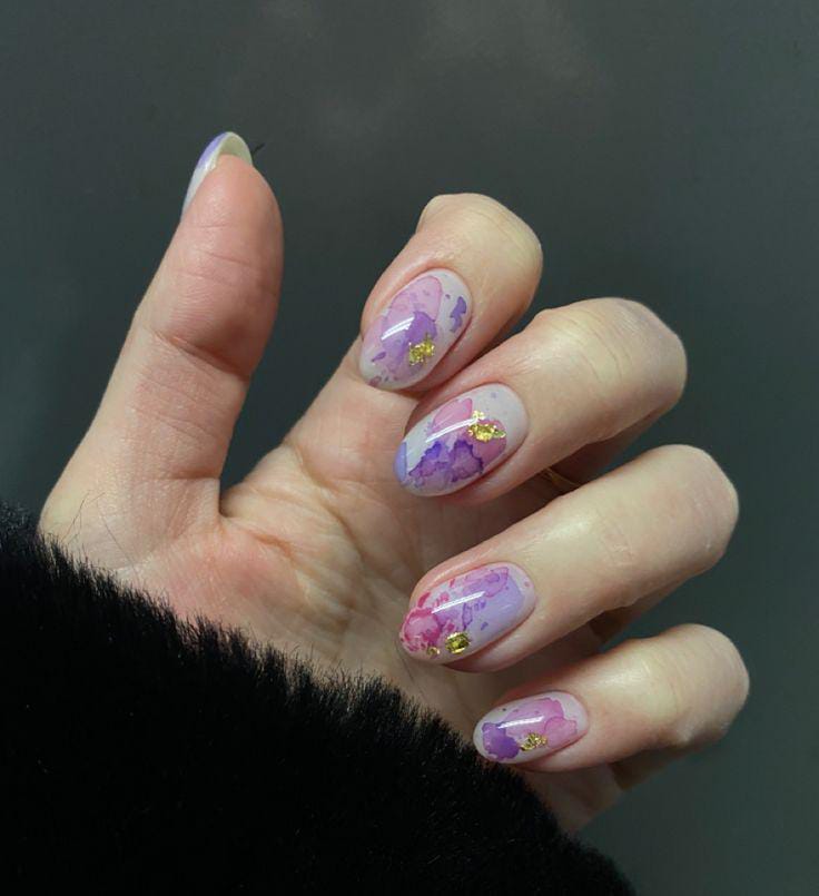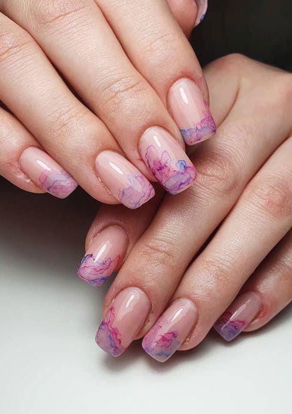 Pink and purple marble tones melt together with a dreamy, cloud-like effect. The look is smooth, feminine, and slightly glossy for a modern spring finish.