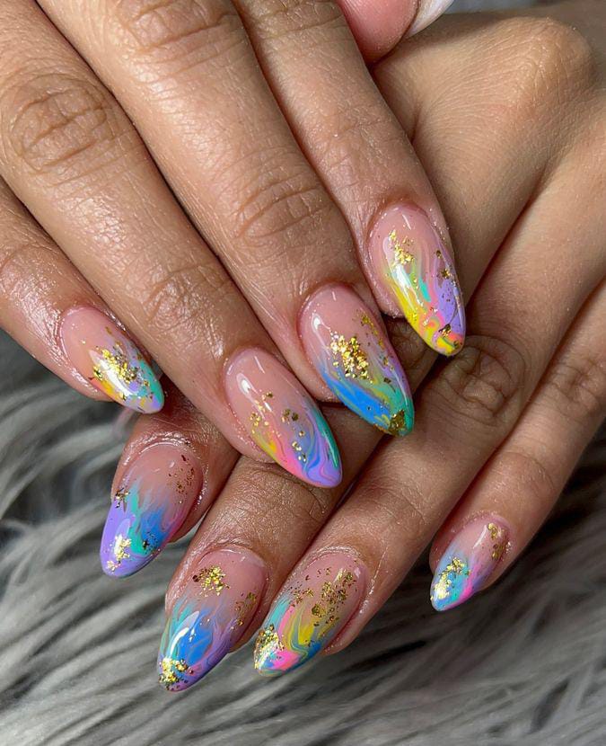 A sheer nude base is layered with smooth rainbow marble swirls that feel airy and elegant. Scattered gold flakes give the design a polished, spring-ready finish.
