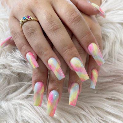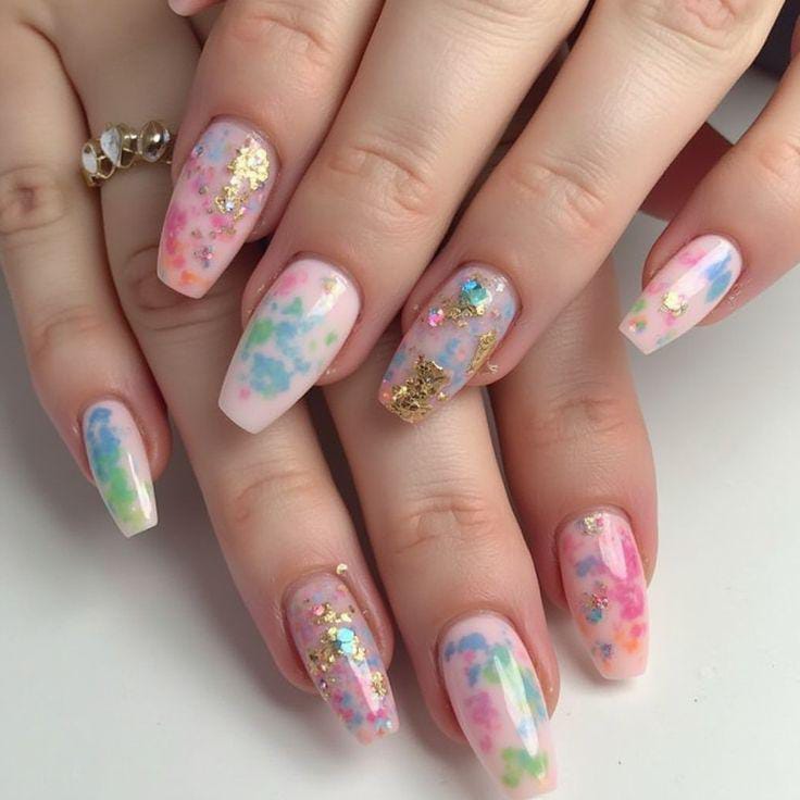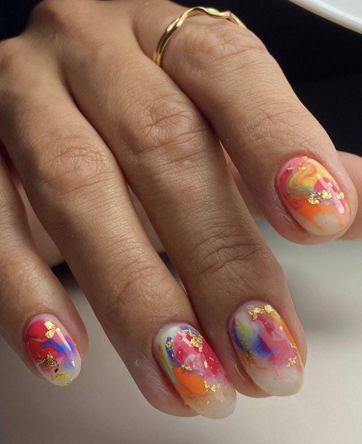 A translucent nude base features bright pink, yellow, and blue marble swirls with tiny gold flecks. The look is vibrant, dreamy, and full of spring energy.