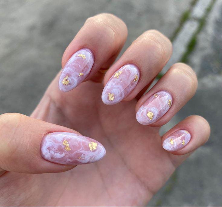 Milky pink marble nails are enhanced with subtle gold flecks for a refined spring touch. The design feels luxurious but light, balancing softness with a hint of sparkle.