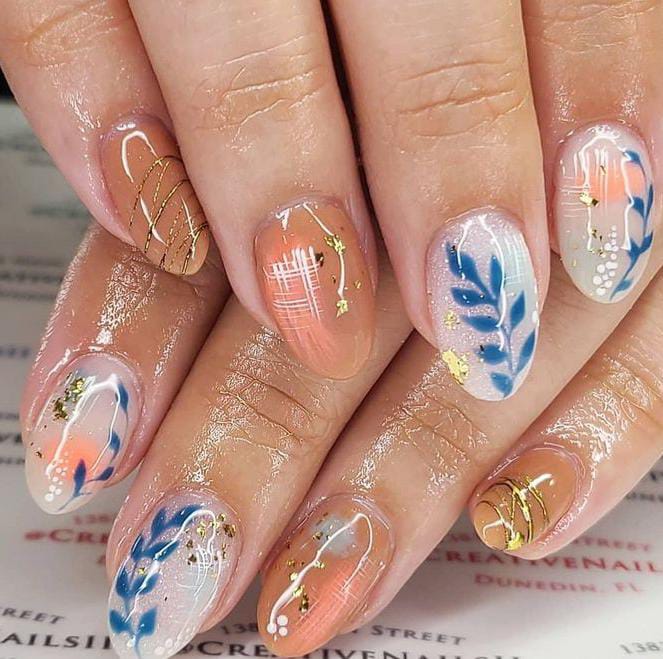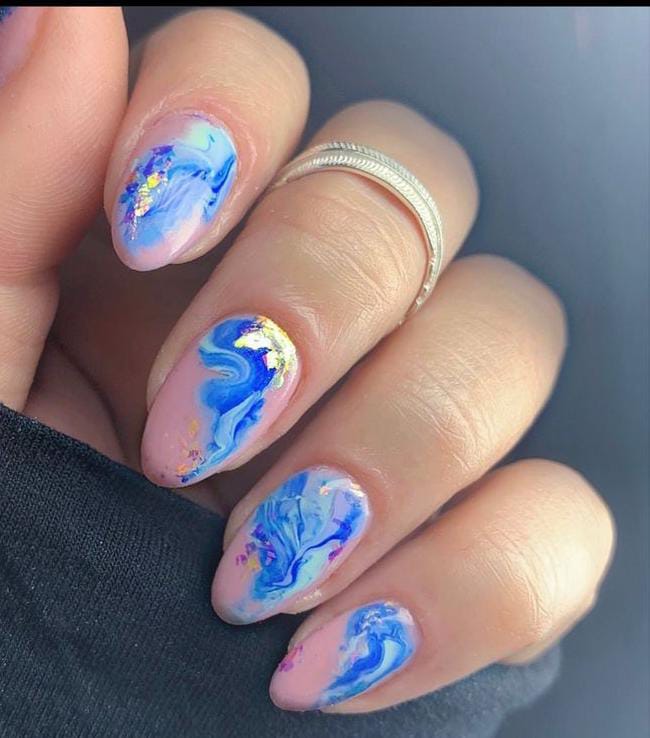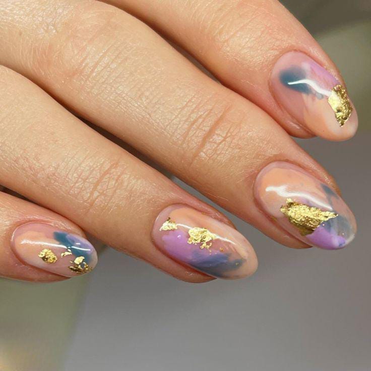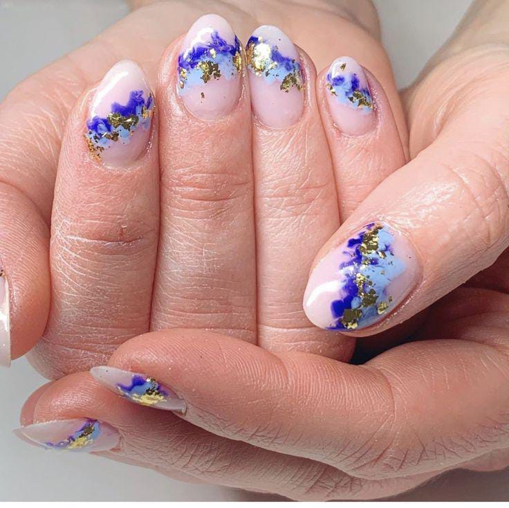 Soft nude nails are layered with blue marble accents and hints of gold foil, giving a delicate yet artistic spring feel. The design feels airy, elegant, and lightly luxurious.