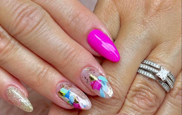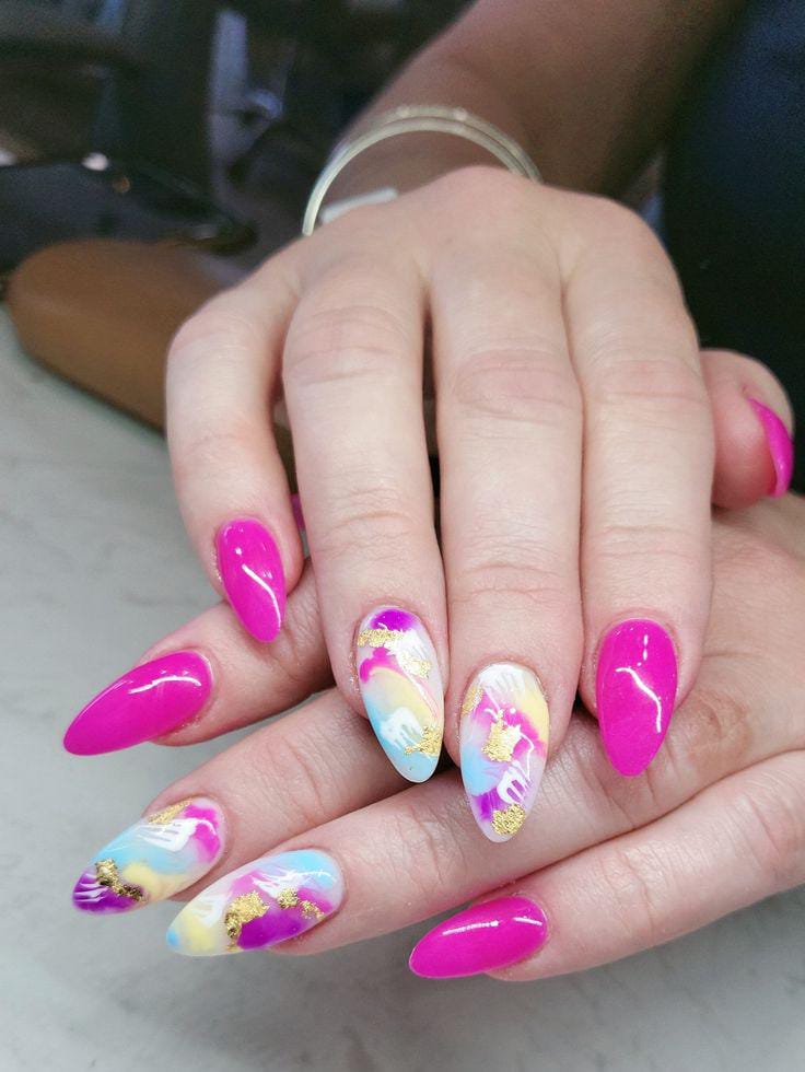 Bold hot pink nails are paired with soft marble accents in pastel blue, yellow, pink and white. The look feels vibrant, artistic, and perfect for a playful spring statement.