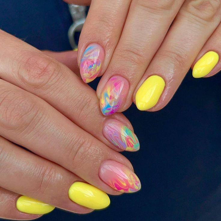 Bright yellow nails contrast beautifully with multicolored marble swirls in pink, blue, and orange tones. The design gives a cheerful, energetic spring vibe that feels fresh and modern.