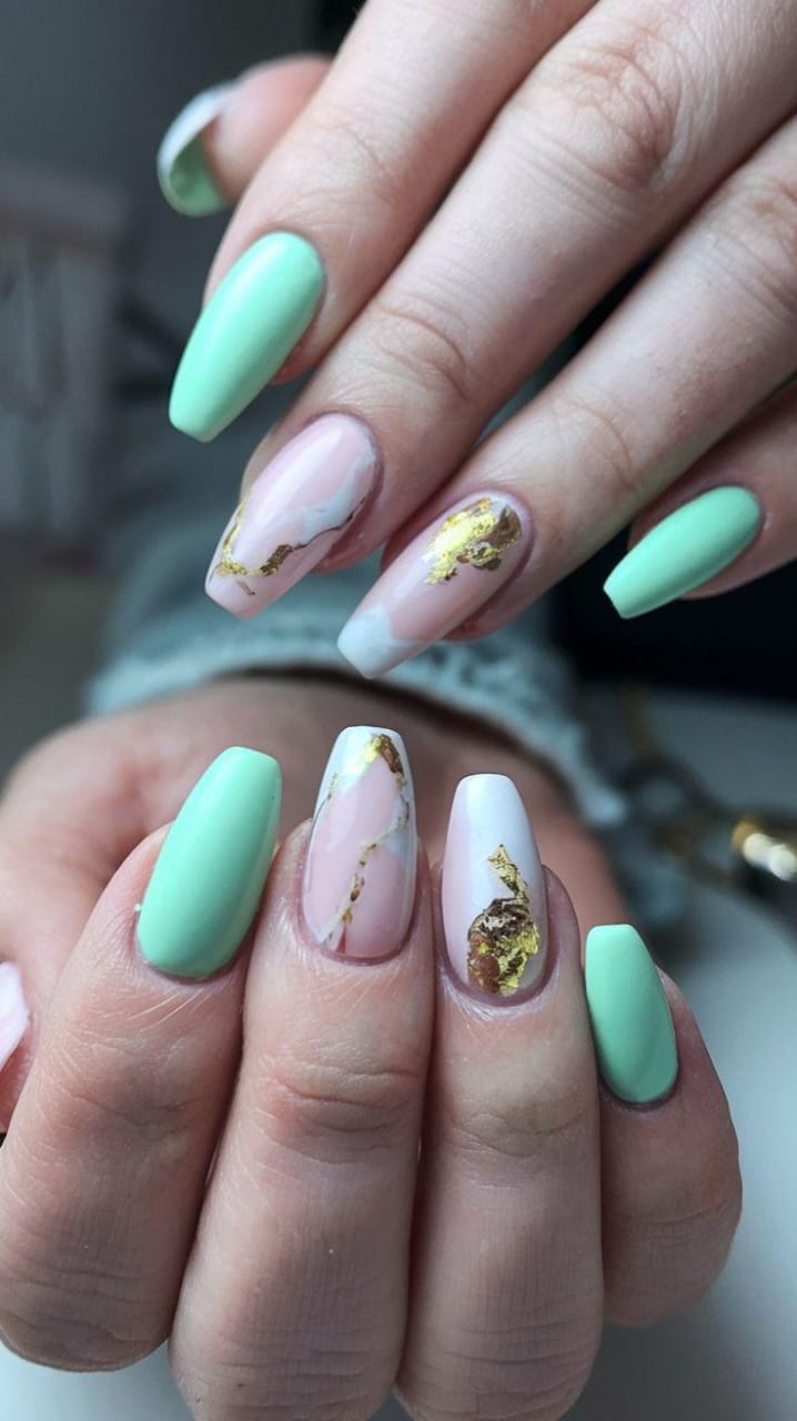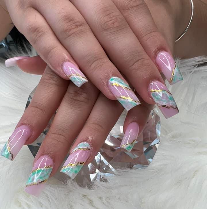 A glossy pink base pairs with mint-green marble French tips and thin gold lines for a fresh, modern look. The vibe is clean, trendy, and perfect for spring glam.