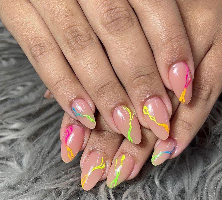 A glossy nude base is accented with thin, neon marble lines in bright spring shades. It has a playful, modern spring vibe while still staying clean and minimal.