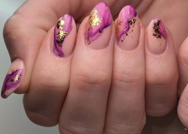 Muted nude nails are layered with purple marble accents and hints of gold foil. The look is bold yet refined, inspired by natural spring stone textures.