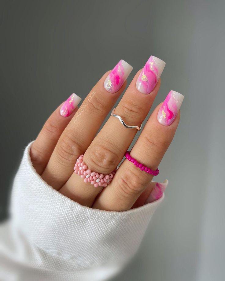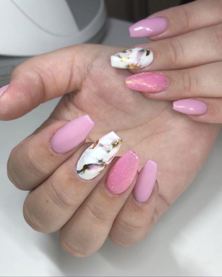 Glossy pink nails are balanced with abstract marble accents featuring soft pastels and gold flecks. The design feels fun, feminine, and slightly glamorous spring aesthetic.